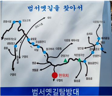 선바위에서 북동쪽으로 길을 잡아 잠시 후 범서읍 구영리 장구산성 올라가는 입구에 도착했다. 산이 높지는 않으나 노인으로서 오를 수 있을까 자신이 없다. 체력 단련 삼아 천천히 오르기로 한다. 《삼국사기》는 신라 내해이사금(奈解尼師今 재위 196∼230) 때 가야연맹 포상8국 중 골포(骨浦) 칠포(柒浦) 고사포(古史浦) 세 나라가 연합하여 신라에 침입했는데 갈화성(竭火城)에서 물계자(勿稽子) 지휘하에 승리했다고 전한다. 물계자는 한국 선도의 큰 스승이며 박제상 아버지다. 장구산성이 갈화성이라고 한다. 장구산은 바다로 침입한 적군이 태화강을 건너 서라벌로 진격하는 최단 거리에 있는 요충지다. 정상까지 오르는 길 주변에 성곽 흔적은 보이지 않는다. 쉬엄쉬엄 정상에 올라서 보니 사방을 감제할 수 있는 군사적 요충으로 산성을 쌓았음직한 곳임을 알겠다. 역시 백문이 불여일견이다. 장구산에서 내려오니 몸이 가볍고 상쾌하다. 아래 사진은 장구산성 오르는 안내판인데 ‘산성만디‘가 장구산 정상이다. ‘만디‘는 산꼭대기를 의미하는 정겨운 경상도 말이다. 안내판 내용으로 보아 지자체가 장구산성을 잘 모르는 것 같다.