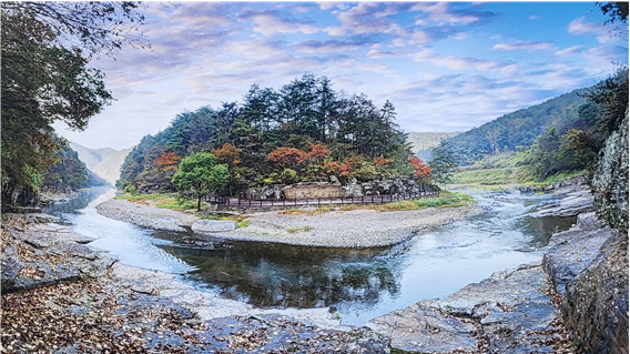 울주군 두동면 천전리(川前里) 암각화(국보 147호)와 대곡리 반구대(盤龜臺) 암각화(국보 285호)는 ‘반구천 암각화’라는 이름으로 2025년 7월 12일 UNESCO 세계문화유산으로 지정되었다. 반구천은 태화강 지류다. 상류에 천전리 하류에 대곡리가 있고, 암각화는 반고천에 면한 절벽에 새겨져 있다. 반구천 하류에 사연댐이 있어 반구대 암각화는 댐 수위가 낮아 암각화가 물에 잠기지 않아야 배를 타고 들어가서 볼 수 있기에 이번 답사에는 갈 수 없다고 한다. 아쉽지만 어쩔 수 없다. 한참 지나 천전리 암각화 입구에 도착했다. 지난 봄 여기에 왔을 때는 복숭아 꽃이 만발했었다. 지금은 겨울이라 다소 을씨년스럽다. 일찍 도착한 지라 입구가 한가하다. 아래 사진에서 보는 바와 같이 반구천이 휘돌아 나가는 중간 절벽에 암각화가 있다. 그림 오른쪽 시멘트 다리를 건너 언덕배기를 좀 올라가서 다시 절벽을 내려가야 암각화를 볼 수 있다. 암각화가 있는 절벽에서 냇물 건너편은 암반이고 거기에 공룡 발자국도 남아 있다.